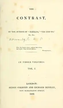 The Contrast is an 1832 novel by the British writer and politician Lord Normanby, originally published in three volumes.[1] [2] It was his third novel following Matilda (1825) and Yes and No (1828), all three of which were part of the developing silver fork genre focused on the fashionable aristocracy and upper classes of the late Regency period. It was written at the time of the Reform Act and examines the mixing of relationships across classes.