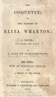 The Coquette or, The History of Eliza Wharton is an epistolary novel by Hannah Webster Foster. It was published anonymously in 1797, and did not appear under the author's real name until 1856, 16 years after Foster's death. It was one of the best-selling novels of its time and was reprinted eight times between 1824 and 1828.[1] A fictionalized account of the much-publicized death of a socially elite Connecticut woman after giving birth to a stillborn, illegitimate child at a roadside tavern, Foster's novel highlights the social conditions that lead to the downfall of an otherwise well-educated and socially adept woman.