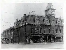 The Crofoot Building, located at the crossroads of Pontiac's original 1818 plot, has anchored the Southeast quadrant of Pontiac since 1882. The building's central tower once displayed, in raised masonry letters, the name of its builders, the locally prominent Crofoot family. The Crofoot Building's three 20-foot-wide (6.1 m) bays and two stories of street-level store and second-floor office uses originally formed and still retain the urban pattern of 19th century Pontiac. Facade remodelings and occupant turnovers have little changed this pattern of uses. The Crofoot Building's street level has housed barbers, meat markets, an American Express office, saloons, lunch rooms, shoe stores and millinery shops; while the second floor has housed photographers, land developers, tailors, insurance agencies, and attorneys. The third floor (no longer extant) once housed Judge Michael E. Crofoot's legal offices.
