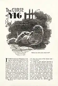 ![]() Title page of "The Curse of Yig" as it appeared in Weird Tales, November 1929. Illustration by Hugh Rankin.[1] | |