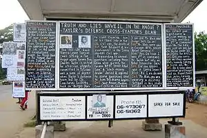 ![]() The May 24, 2008 board describing former President Charles Taylor's war crimes trial | |