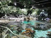 The aquarium uses a combination of hands-on interactive displays, audiovisual presentations, and living exhibits to tell the story of the world's oceans. The museum includes a series of exhibits presenting a chronological journey from the beginning of time through the present day oceans. There is also an interactive area where visitors can learn to control an underwater diving vessel.
