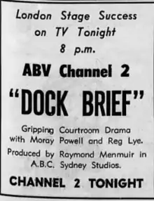 8. ""Dock Brief" Telecast from ABN". Sydney Morning Herald. 28 January 1960. p. 5.