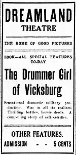 - ↑ "'Drummer Girl of Vicksburg'...at the Dream tonight", The Ketchikan Miner (Ketchikan, Alaska), February 28, 1913, p. 1, col. 4. Retrieved via Chronicling America, April 22, 2023.