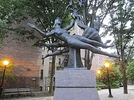 Chaim Gross' The Family is installed at West 11th Street and Bleecker Street. The bronze sculpture was cast in 1979 and dedicated on May 27, 1992. Karahan Schwarting Architectural Co. is credited as the architect and Bedi-Makky Art Foundry served as the foundry; Lithos International is credited as the pedestal's fabricator. It depicts a family of five and includes two large and three small figures. According to the New York City Department of Parks & Recreation, "The adults are reaching up, as if towards the sky, as they support three children in their hands. The adult figures float gracefully and symmetrically, portraying a harmonious family unit."[1] The sculpture is 7 feet, 6 inches tall and wide. It rests on a Carnelian red granite pedestal that measures 6 feet tall and 4 feet wide, with a diameter of 3 feet. An inscription reads, "THE FAMILY / 1979 / CHAIM GROSS /---/ DONATED TO THE CITY OF NEW YORK, 1991 / IN HONOR OF / EDWARD I. KOCH / MAYOR 1978–1989".[1]