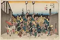 The Hōeidō edition is properly titled Tōkaidō Gojūsan-tsugi no uchi (東海道五十三次之内).[8] Besides the fifty-three stations themselves, the series includes one print for the departure, Nihonbashi (the bridge of Japan), and a final one, the 55th print, Keishi, Kyoto, the imperial capital.