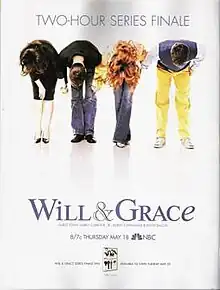 The series finale was heavily promoted by NBC, and the main cast members appeared on The Oprah Winfrey Show, The Today Show, and Live with Regis and Kelly to bid farewell.[7] NBC devoted a two-hour block in its primetime schedule on May 18, 2006, for the Will & Grace send-off. An hour-long series retrospective, "Say Goodnight Gracie", featuring interviews with the cast, crew, and guest stars, preceded the hour-long series finale.[8][9][10][11] The retrospective was viewed by an estimated 12.7 million viewers,[12] while the finale drew 18.43 million viewers[13] and a Nielsen rating of 11.5/18,[14] making it the most watched episode of the final two seasons of Will & Grace.[13]