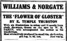The Flower of Gloster is a 1911 book by E. Temple Thurston. Published by Williams and Norgate,[1] it sold well enough to merit a second edition two years later. A third unillustrated edition was published by Chapman and Hall in 1918, after which the book remained out of print for over half a century until being republished by David & Charles in 1968. A year before that, ITV had broadcast a 13-part children's serial of the same name loosely based on Thurston's original narrative.[2]