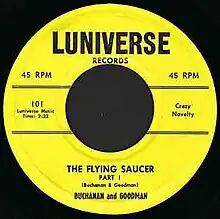 "The Flying Saucer" (also known as "The Flying Saucer Parts 1 & 2") is a novelty record, the first of a series of break-in records released by Bill Buchanan and Dickie Goodman (credited simply as "Buchanan & Goodman"). The song is considered to be an early (perhaps the earliest) example of a mashup, featuring segments of popular songs intertwined with spoken "news" commentary to tell the story of a visit from a flying saucer.