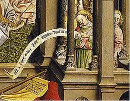 The top level shows a Deësis scene, with God the Father in the center, flanked by the Virgin Mary and St. John the Evangelist. This passage closely resembles a similar scene in the Ghent Altarpiece.[4] All three figures are seated in front of hanging oriental style carpets.