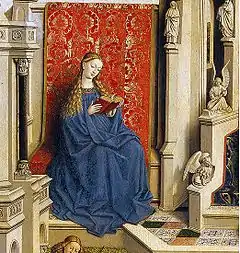 Mary is seated and reading a red book, probably a book of hours. She wears a blue gown, the folds and cloth of which are closely detailed. She has blond hair which is unbraided and falls over her shoulders. In contrast to her depiction in the Ghent Altarpiece, here her dress is plain, lacks any embroidery or gilded lining, while her book is not girdled. John is dressed in a green robe, also has blond hair and sits writing in a holy book.