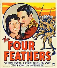 The Four Feathers is a 1929 American sound war film directed by Merian C. Cooper and starring William Powell, Richard Arlen, Clive Brook and Fay Wray.[1] This was the third of numerous film versions of the 1902 novel The Four Feathers written by A. E. W. Mason. While the film has no audible dialog, it was released with a synchronized musical score with sound effects using both the sound-on-disc and sound-on-film process. The 1929 version of The Four Feathers premiered at the Criterion Theatre in New York City on June 12, 1929.[2]