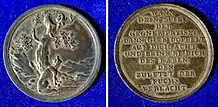 The fable also figured in church architecture, most notably on a column in the Romanesque church of San Martín de Tours in Spain. In later centuries the fable was used on household china,[31] on tiles,[32] on vases,[33] and figured in the series of La Fontaine medals cast in France by Jean Vernon.[34] A less conventional use was the hydraulic statue built for the Versailles Labyrinth that was constructed for Louis XIV, one of thirty nine sets of statues in the maze illustrating Aesop's fables.[35][36] The fox and the crow eventually figured, among many other beasts, on the grandiose monument to La Fontaine designed by Achille Dumilâtre in 1891.[37] This stood at the angle of the Jardins de Ranelagh between the Avenue Ingres and Avenue du Ranelagh in Paris XVI and was melted down during World War II. It was replaced by Charles Correia's present monument in 1983. This portrays the fabulist standing and looking down at the cheese-bearing crow at his feet, while the fox gazes up at it from the steps to the pedestal.[38] In Russia, too, there was an adaptation of La Fontaine's fable by Ivan Krylov, "The Crow and the Fox" (in this case little different from the French original),[39] which figures among several others on panels around Andrey Drevin's monument beside the Patriarch Ponds in Moscow.