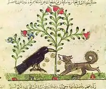 An Eastern story of flattery rewarded exists in the Buddhist scriptures as the Jambhu-Khadaka-Jataka.[9] In this a jackal praises the crow's voice as it is feeding in a rose-apple tree. The crow replies that it requires nobility to discover the same in others and shakes down some fruit for the jackal to share.