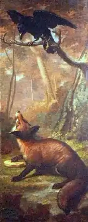 Isabelle Aboulker included the fable among the seven in her children's 'fabl'opera' La Fontaine et le Corbeau (1977) for mezzo-soprano, baritone, children's voices and small chamber orchestra.[23] Jean-Marie Morel (b. 1934) also exploits its dramatic possibilities in what he describes as his small cantata, La Fontaine en chantant (1999), for children's choir and string quartet. David Edgar Walther prefers the term ‘short operatic drama’ for his Aesop's Fables (2009), a 12-minute cycle with libretto by the composer in which "The Fox and The Raven" appears as the first of three pieces. The fable was also choreographed by Dominique Hervieu in 2003 for Annie Sellem's composite ballet project, Les Fables à la Fontaine. In it two dancers perform to a sound fusion score accompanied by video affects.[24][25]