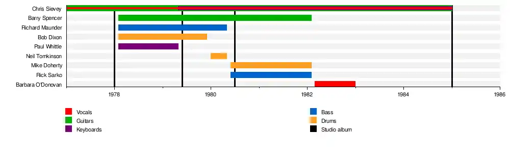 On the Freshies' first release, 1977's All Sleep's Secrets, Sievey was the only credited artist.[9] The earliest known line up of the band beyond just Sievey also consists of Barry Spencer on vocals and guitar, Paul Whittle on keyboards, Richard Maunder on bass, and Bob Dixon on drums. This is the lineup featured on the 1978 promo cassette Manchester Plays.[10] The 1979 Banana Island album credits a similar line-up, minus Paul Whittle who is replaced by Sievey on keyboards.[11] In 1980, Bob Dixon was replaced by Neil Tomkinson on drums for the "Yellow Spot"[12] and "My Tape's Gone" singles,[13] before himself being replaced by Mike Doherty for the Rough N Ready mini-album. Also replaced for the mini-album was Richard Maunder on bass guitar, who was replaced with Rick Sarko.[14] This line up would play on two 1981 singles; "Dancin' Doctors"[15] and "If You Really Love Me, Buy Me a Shirt",[16] before breaking up. In 1982, Sievey would release a single with Barbara O'Donovan under the name the Freshies, titled "Fasten Your Seatbelts". In 1984, he released an untitled solo EP as the Freshies, and in 1985 would release The Johnny Radar Story, as the Freshies.