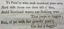 The printed section of 'Burns's' poems followed a protocol personal and many place names were given a degree of anonymity by replacing most letters with asterisks,[14] however to assist the bishop, Burns wrote in the missing letters and he also provides extra details such as the real name of 'Doctor Hornbook' being 'John Wilson Schoolmaster, Tarbolton'. After the 'Lord President Dundas' poem he added a note: