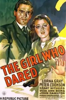 The Girl Who Dared is a 1944 American mystery film directed by Howard Bretherton and written by John K. Butler. The film stars Lorna Gray, Peter Cookson, Grant Withers, Veda Ann Borg, John Hamilton and Willie Best. The film was released on August 5, 1944, by Republic Pictures.[1][2][3]