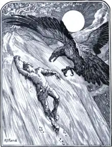 ![]() The eagle attacks the youth on the slopes of Glass Mountain. Illustration from The Yellow Fairy Book (1894). | |