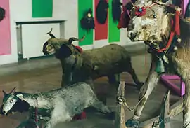 Ion Creangă's tale has left an enduring mark on the Romanian education system. It has been a traditional feature of textbooks and reading recommendations for the youngest students throughout the 20th century, and has remained so into the 21st.[7] A part of this period corresponded to communist rule, during which the text was reportedly given an ideologized interpretation. Discussing the paraliterary propaganda of primers issued under communism as the a "political fairy tale subject to communist legality", literary critic Ion Manolescu referred to a 1986 edition, which featured an adapted and illustrated version of Creangă's tale, as confronting "a patibulary wolf with a bourgeois appearance" to "a goat dressed in peasant costume".[8] "The Goat and Her Three Kids" inspired works in various media from as early as the interwar, when it was turned into a musical theater play for children by Romanian composer Alexandru Zirra.[9] Such derivative works were also produced throughout communism and after the 1989 Revolution. They include Cristian Pepino's puppet theater adaptation, which premiered in 2002.[10]