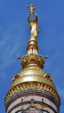 The Golden Virgin was designed by French sculptor Albert Roze in 1897 and it was placed atop the Basilique Notre-Dame de Brebières. The sculpture depicts a golden-colored Virgin Mary holding the infant Christ high above her head.[4] The sculpture was covered with 40,000 sheets of gold leaf. It also was 5 m (16 ft) tall and there were 238 steps leading to the sculpture. More and more pilgrims continued to visit the site and Pope Leo XIII was made aware, and visited the site in 1898.[5] Leo XIII christened the church and seeing The Golden Virgin, he called the basilica the "Lourdes of the North". The sculpture was fastened atop the bell tower.[6] In 1915, it was leaning after 2,000 shells hit the town and basilica.[6] Engineers fastened a chain to prevent it from toppling.[upper-alpha 3]