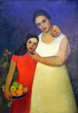 The painting was made by Lucia Nicolaidou-Vasiliou, the first woman from Cyprus to study painting abroad,[2] particularly in France. In this canvas she demonstrates the obvious influence of Paul Gauguin as shown in the areas of the forms, the theme and the symbolism.[1] The painting stands out for its large color surfaces and for the female figures mother and daughter, symbolizing the quest for innocence, while exuding a sense of sensuality absent from the corresponding women depicted in the works of other Cypriot artists of that period.[1][3]