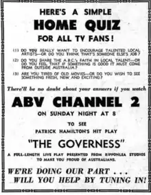 It was the first in a series of "live" dramas to be broadcast every fortnight on Sunday night on ABV-2. (Either broadcast live in Melbourne or telerecordings of plays originally broadcast live in Sydney.) This was in response to criticism of viewers of "old American and British films". Mr Ewart Chapple, Victorian manager of the ABC, said when announcing the policy that ""We have complete faith in local artists and in their ability to provide entertainment of world standard."[4]