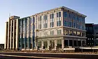 Construction was underway again in March 2014, with Martin-Harris Construction as the general contractor. The first office and residential tenants were expected to begin moving in later that year.[21][22] HMS Holdings signed a deal to become the first major office tenant, leasing 65,000 sq ft (6,000 m2) in The Gramercy.[23] Regus also signed on as an office tenant.[24] Other tenants have included Bank of Internet USA, CalAtlantic Homes, and Liberty Mutual.[25] WGH believed that there was strong demand in the area for restaurants, prompting the decision to include several eateries at The Gramercy. Retail was no longer planned for the project, and options were being considered for the decrepit nine-story tower.[14] The Gramercy's opening was marked on November 6, 2014, with the installation of a 10,000-pound letter "G" sculpture.[26]