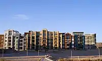 Buildings in the project had Manhattan-inspired names, including Tribeca House and Gramercy House.[3] The flagship nine-story building, known as Element House,[4] would include 73 units,[5] a 70,000 sq ft (6,500 m2) fitness center,[4] and a rooftop deck and lounge with views of the Las Vegas Strip and Red Rock Canyon.[6] The two other residential buildings, as well as the two office buildings, were four stories high.[7] The complex would ultimately consist of 12 buildings, and would include 150,000 sq ft (14,000 m2) of Class A office space, as well as 43,000 sq ft (4,000 m2) of ground-floor retail space. The project would feature approximately 30 retailers and four restaurants.[8]