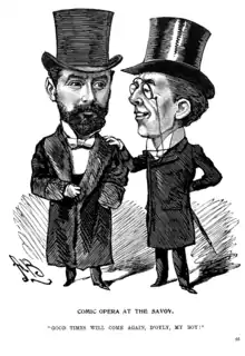During the production of Gilbert and Sullivan's 1889 comic opera, The Gondoliers, Gilbert became embroiled in a legal dispute with producer Richard D'Oyly Carte over the cost of a new carpet for the Savoy Theatre and, more generally, over the accounting for expenses of the Gilbert and Sullivan partnership. Sullivan sided with Carte (who was about to produce Sullivan's grand opera, Ivanhoe), and the partnership disbanded. After The Gondoliers closed in 1891, Gilbert withdrew the performance rights to his libretti and vowed to write no more operas for the Savoy.[1] The lawsuit left Gilbert and Sullivan somewhat embittered, and though they finally collaborated on two more works, these suffered from a less collegial working relationship than the two men had typically enjoyed while writing earlier operas.[2]