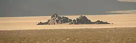 The Grandstand is located in the northwest corner of Racetrack Playa and is the only feature, other than small scattered rocks and a dolomite outcrop on the northernmost shore, that interrupt the playa. The southernmost of the two rock mounds that compose The Grandstand is the tallest, by a few feet. It rises approximately 20-metre (66 ft) above the very flat surface of the playa, whose north end is only 1.5-inch (3.8 cm) higher than the southern end. Racetrack Playa is at an elevation of 3,714 feet (1,132 m)[2] above sea level, and is 2.8-mile (4.5 km) long (north-south), and 1.3-mile (2.1 km) wide (east-west).