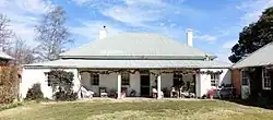 The original farmhouse has a verandah which originally surrounded the house entirely and is believed to be one of earliest examples of a wrap-around verandah built in Australia.[11] The verandah has been enclosed on two northern corners to form rooms that now connect the farmhouse to the cottage and the kitchen-garage wing. An "outdoor" room has also been added c. 1980 near the southwest corner of the farmhouse. The verandah has a separated roof with a lower pitch than the main roof, a solution favoured aesthectially from the mid-1830s.[12] The walls of the farmhouse are rendered brickwork. A partition wall within the kitchen wing is constructed of pise. The original windows on the farmhouse are timber-framed, double-hung with six lights per pane, fine glazing bars and mostly original glass. The original entrance (facing south towards the river) has a formal symmetrical facade with a central door and half round fan-light with 8 panels. The original shingles for the roof, manufactured locally, are believed to be still in place beneath the corrugated iron roof. The most intact part of the original farmhouse is its hallway.[1]