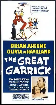The Great Garrick is a 1937 American historical comedy film directed by James Whale and starring Brian Aherne, Olivia de Havilland, and Edward Everett Horton. The film also features Lionel Atwill, Luis Alberni, Melville Cooper, and future star Lana Turner,[1] who has a bit part. Based on the play Ladies and Gentlemen by Ernest Vajda,[2] the film is about the famous eighteenth-century British actor David Garrick, who travels to France for a guest appearance at the Comédie Française. When the French actors hear rumours that he said he will teach them the art of acting, they devise a plot to teach him a lesson. Though often overlooked by critics in favor of Whale's horror films, The Great Garrick was chosen by Jonathan Rosenbaum for his alternative list of the Top 100 American Films.[3]