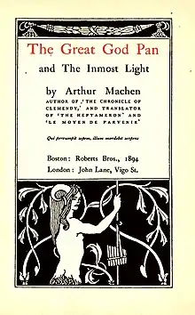 The Great God Pan is a horror and fantasy novella by Welsh writer Arthur Machen. Machen was inspired to write The Great God Pan by his experiences at the ruins of a pagan temple in Wales. What would become the first chapter of the novella was published in the magazine The Whirlwind in 1890. Machen later extended The Great God Pan and it was published as a book alongside another story, "The Inmost Light", in 1894. The novella begins with an experiment to allow a woman named Mary to see the supernatural world. This is followed by an account of a series of mysterious happenings and deaths over many years surrounding a woman named Helen Vaughan. At the end, the heroes confront Helen and force her to kill herself. She undergoes a series of unearthly transformations before dying and she is revealed to be a supernatural entity.