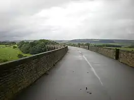 There are three viaducts on the route; Cullingworth,[11] Hewenden and Thornton.[12] Both Hewenden and Thornton viaducts are grade II listed structures[13][14] and Thornton is particularly noted for its S-shaped curvature and its views over the Pinch Beck valley.[15] A platform has been installed at Hewenden to allow for a greater views across the viaduct and westwards across Hewenden reservoir.[16]