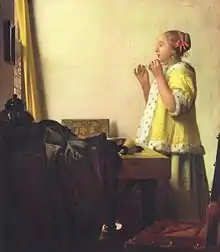 In this painting, Vermeer depicts a young girl strumming a guitar. The instrument is placed comfortably on her lap while she plays near a window, sitting in the corner of a room. Her attire is made up of an ermine-bordered yellow jacket, an ivory-colored satin dress, and a pearl necklace.[5][7] Surrounding her is a painted pastoral landscape bordered by an extravagant picture frame, a blank wall, three books, and a guitar.[5][7] Prior to this painting, Vermeer portrayed individuals with obscure expressions.[3] On the contrary, this young girl has an open expression that is joyous and flirtatious. The girl's smile and tipped head, along with the fixed gaze on something just outside the painting suggests that she is playing not for us, but for an unseen individual.[6][7][3] Her dress and hairstyle reflect the relevant fashions of the wealthy Dutch, in that day.[3]