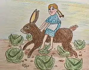 Once there was a woman and her daughter who lived together in a pretty little house and whose pretty little garden had a plot full of cabbages. A hare managed to get into the plot and throughout the Winter months he slowly and quietly ate the cabbages. At last, the mother told her daughter to go into the cabbage plot and chase the hare off. The girl found the hare and said, "Hare, you must go for you are eating all our cabbages!" The hare turned to the girl and said, "Sit on my little hare's tail and come with me to my little hare's hut." But the girl refused to go with him.