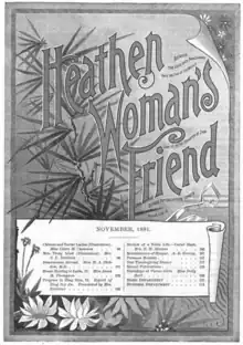 Hodgkins introduced some new features, a department of "Family News," also a "Post-office Box," and brought out some special numbers. The first was in March, 1894 —the 25th anniversary number— which was embellished with photo-engravings of the founders, Mrs. E. W. Parker (Lois Lee Parker) and Mrs. Wm. Butler (Clementina Rowe Butler); and first missionaries, Isabella Thoburn and Dr. Clara Swain. The subscriptions in 1895 were nearly 22,000.[4] But some considered the newspaper's name to be controversial and so a name change was discussed in St. Louis in 1896, with supporters claiming that it "expresses so much" while others argued that it was a "misnomer", even a "hindrance to their work".[10] After discussion, it was renamed Woman's Missionary Friend.[11] Philip Butler, a Boston artist, would design the cover.[12]