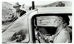 Nan's car is a light-colored 1959 Mercury Montclair four-door hardtop that had the inside rear-view mirror and front door vent windows removed. However, in the scene where Nan swerved toward the hitch-hiker, the car shown is a dark 1957 Ford Custom or Fairlane four-door sedan.