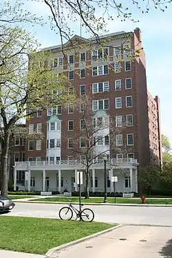The Homestead is a historic apartment hotel at 1625 Hinman Avenue in Evanston, Illinois. Opened in 1928, it was one of several apartment hotels built in Evanston in the 1920s. Popular in the early twentieth century, apartment hotels housed a mixture of short-term and long-term guests; they were frequently used by workers who did not wish or could not afford to live near their workplace full-time. Architect Philip Arthur Danielson designed the building in the Colonial Revival style, which was used on many other apartments from the era in Evanston. The design includes a verandah supported by Doric columns along the front facade, two projecting three-bay windows, brick quoins, and a dentillated cornice with a pediment.[2]