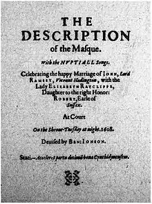The masque celebrated the marriage of John, Lord Ramsay, Viscount Haddington, to Lady Elizabeth Radclyffe, the daughter of Robert Radclyffe, 5th Earl of Sussex. Following the precedent of the masque Hymenaei in 1606, the marriage was celebrated at Court because it involved an important Scottish nobleman marrying an English aristocrat, which was in keeping with the policy of King James I to favor close ties between his two kingdoms. The groom, the former Sir John Ramsay, was a close confederate of the King, and had saved James from assassination eight years earlier.[1] The preparation of the masque was supervised by James's Queen, Anne of Denmark, who was the key promoter of masquing at the Stuart Court.[2]