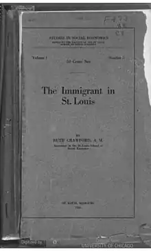 - ↑ Crawford, Ruth. "The Immigrant in St. Louis: A Survey". Hathi Trust Digital Library. Retrieved May 14, 2022.
