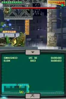 The Incredible Hulk is a side-scrolling platformer in which the player controls the Hulk as he traverses through 30 levels spanning Alaska, Brazil, and the United States.[1][2][3] The narrative, abridged from that of the console version, follows Bruce Banner as he travels the world for a cure to the condition that transforms him into the Hulk while fending off adversaries who seek to destroy him or misuse his power.[1] The Hulk is capable of using melee attacks and thrown objects to dispatch enemy characters and demolish fully destructive environments, and can also jump upon enemies as well as leap to great heights with the use of a shoulder button. Destroying environmental elements increases a "Gamma Gauge" that allows the Hulk to enter a "Gamma Boost" state when it is filled. In this state, the Hulk emits a circular field that kills and destroys anything in its radius. Gamma Boost can be maintained by continuing to engage in environmental destruction, but will deactivate if the Hulk takes a single hit.[3][4][5] Flagpoles and floating satellites can be used to slingshot the Hulk across great distances and break through stronger buildings.[5][6] The Hulk has seven health points that are depleted by enemy attacks, but can be replenished by collecting first aid kits.[2] The Nintendo DS's touchscreen is dedicated to a radar-like map of the current level, allowing the player to view upcoming hazards and secrets.[7] Hidden within the levels are twenty cosmetic skins based on the Hulk's differing personas in the comic series, such as "Gray Hulk" and "Smart Hulk".[3][4] The game includes a multiplayer mode accessible via local wireless play; in this mode, players compete to inflict as much damage as possible upon the environment and against enemies.[2]