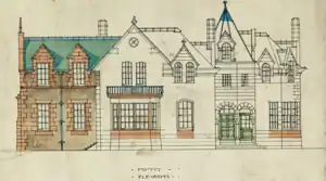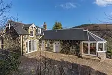 The property is unusual as it stands away from the other three Ballantyne family houses designed by F T Pilkington in Walkerburn (John Ballantyne's house Stoneyhill, David's house Sunnybrae and Henry's former home Tweedvale) but exhibits features found on the other buildings.[64][65][66][67][68] Other Ballantyne villas in the vicinity during this era included Holylee owned by Major James George Ballantyne (1837-1884), and The Firs (Horsbrugh Terrace, Innerleithen) owned by James Ballantyne (1839-1903).[69][70]