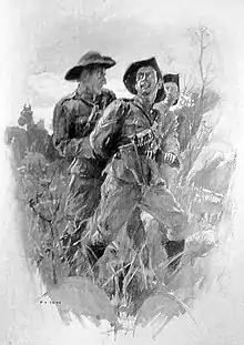 Though both are eager to fight, Bunny makes a poor soldier, while Raffles is an excellent one. Raffles loyally protects Bunny through the ordeal. Connal, a fellow soldier and a brute, hassles Bunny, but is tamed by a fight with Raffles. Bunny watches Connal, and suspects him of being a spy. His suspicions are confirmed when Connal tries and fails to leads their troupe straight into enemy territory, as if by accident. Bunny tells Raffles, though Raffles declares he knew that Connal was a spy from the first day. Raffles suggests that they wait for a chance to apprehend Connal.