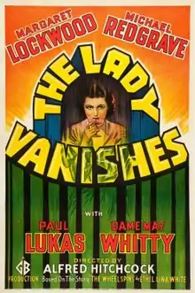 The Lady Vanishes is a 1938 British mystery thriller film directed by Alfred Hitchcock, starring Margaret Lockwood and Michael Redgrave.[1][2] Written by Sidney Gilliat and Frank Launder, based on the 1936 novel The Wheel Spins by Ethel Lina White,[1] the film is about an English tourist travelling by train in continental Europe who discovers that her elderly travelling companion seems to have disappeared from the train. After her fellow passengers deny ever having seen the elderly lady, the young woman is helped by a young musicologist, the two proceeding to search the train for clues to the old lady's disappearance.