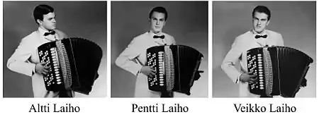 The Laiho Trio was formed by three brothers, Altti U. Laiho (1939 Pori – 2017 Ulvila), Veikko O. Laiho (b. 1942) and Pentti K. Laiho (b. 1944). According to many experts, the trio was extremely unusual in its composition, repertoire, and virtuosity.[1][2][3] [4] The repertoire of the trio consisted of big symphony orchestral compositions arranged for three accordions.[5] The brothers grew up in the city of Pori, in southwestern Finland, but they made their main career in the United States where they lived for years.
