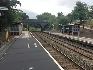 The service in each direction between Birmingham and Stratford runs hourly (including Sundays) with most northbound services running through to Kidderminster. Until the May 2023 timetable change it was a request stop, meaning passengers wishing to board a train here needed to signal their intent to board to the driver; those wishing to alight needing to inform the train conductor.[2] In addition, due to the short length of the platforms, passengers boarding or alighting here must only do so through the front carriage.[3] All services are operated by West Midlands Railway.[4][5]