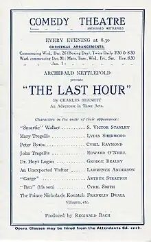 The Last Hour is a 1928 comedy thriller play by the British writer Charles Bennett. At an inn on the coast of Devon, a secret agent battles a foreign prince trying to smuggle a stolen death ray out of the country.
