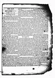 The first issues were priced at 50 cents a year and published in Seneca Falls, New York, as a monthly, eight-page, three-column publication.[1][3] The inaugural issue, published on January 1, 1849, set forth the philosophy and initial goals: "It is WOMAN that speaks through the LILY. It is upon an important subject, too, that she comes before the public to be heard. Intemperance is the great foe to her peace and happiness."[2] Bloomer wrote, "The Lily was the first paper devoted to the interests of woman and, so far as I know, the first one owned, edited and published by a woman."[4] Initially, the title page celebrated this by announcing that it was "Published by a committee of ladies", but after 1850, the masthead featured Bloomer's name alone.[1]